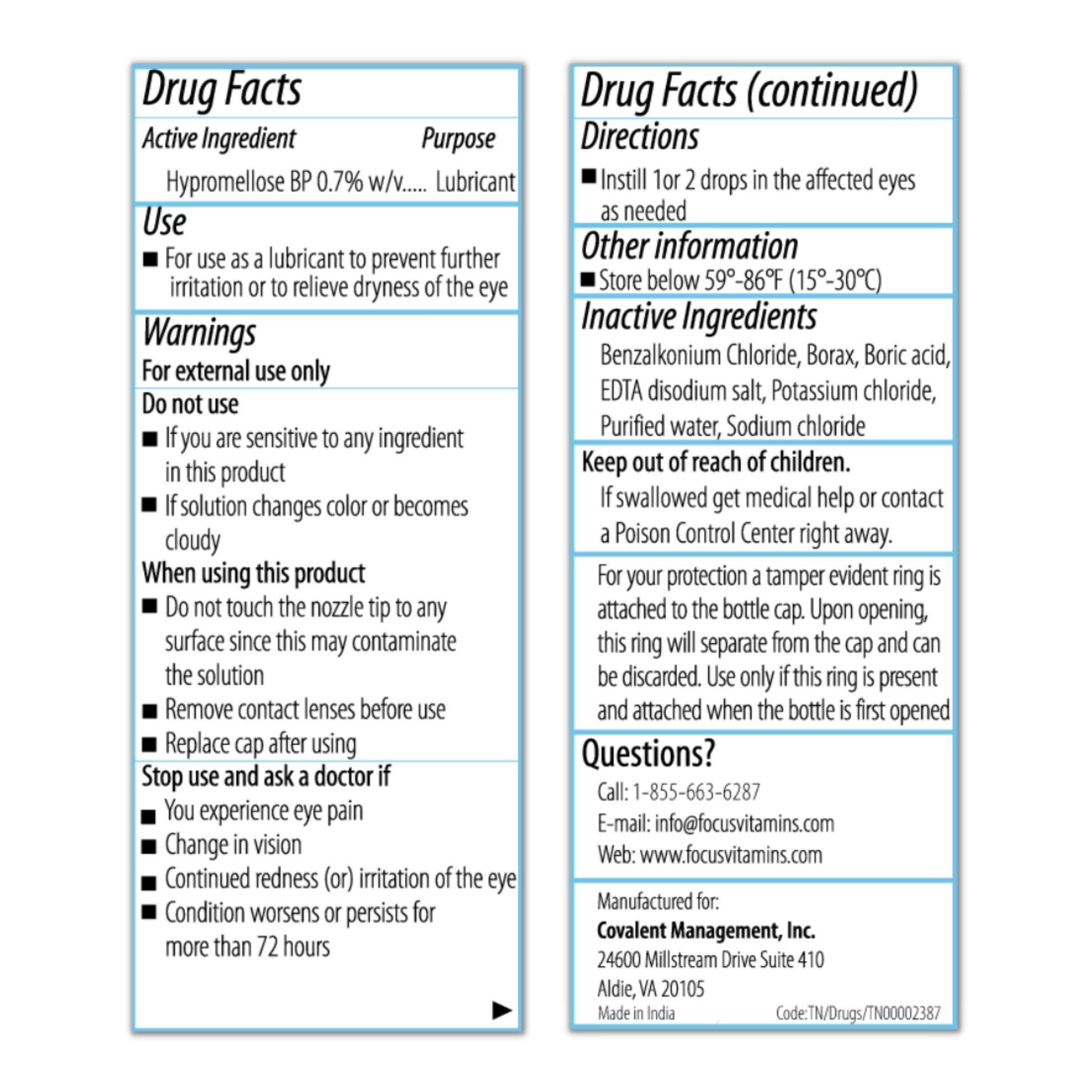 Focus PI eye drops contain 0.7% Hypromellose, a lubricating eye drop used to relieve discomfort and irritation. This drop is ideal for temporary relief of burning and irritation due to dryness of the eye, as well as discomfort due to minor irritations or exposure to wind or sun.